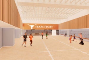 Another highlight of the Bellmont renovations is The Fringe, the new home and practice facility for Texas Cheer and Pom, thanks to the support of Texas Cheer alumna Amy Porter. Named in honor of the cheer team’s iconic fringe uniforms, the third-floor space features a 30-foot ceiling designed for stunts, meeting and study areas, and a Hook ’Em mascot zone, providing the Spirit Squad with a home base that drives excellence both on and off the field.